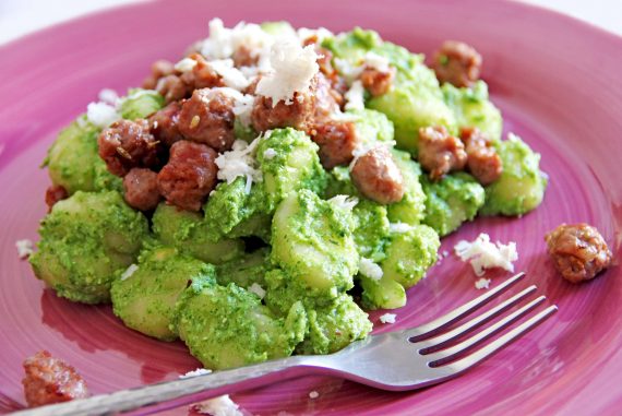 Gnocchi al pesto di rucola e mandorle con salsiccia ai semi di finocchio e ricotta marzotica. Tempo di preparazione: 40 Minuti Tempo di cottura: 15 Minuti…